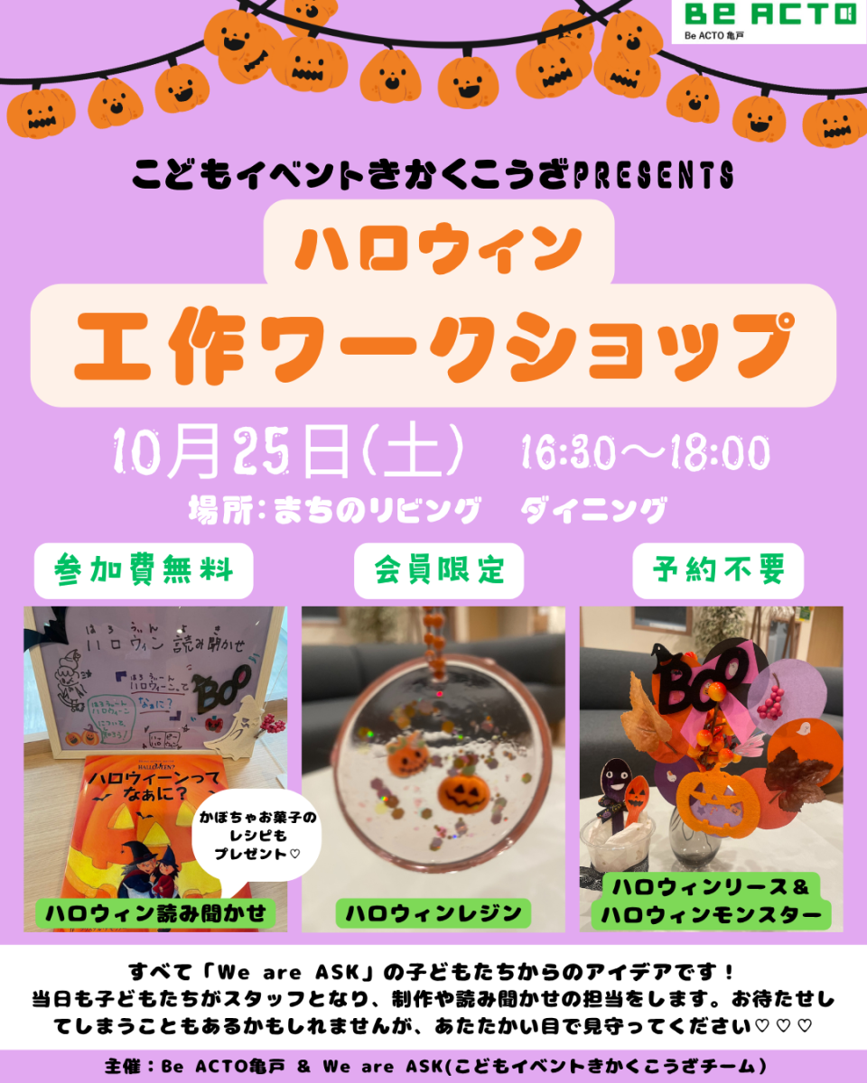 こどもイベントきかくこうざ「We are ASK」チームから、楽しいハロウィン工作ワークショップのおしらせです。