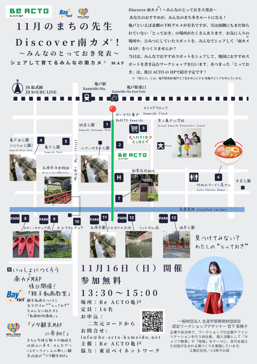 - 11月のまちの先生 11月16日(日)13:30〜15:00「 Discover 南カメ みんなの”とっておき” をシェアしてマップをつくろう」