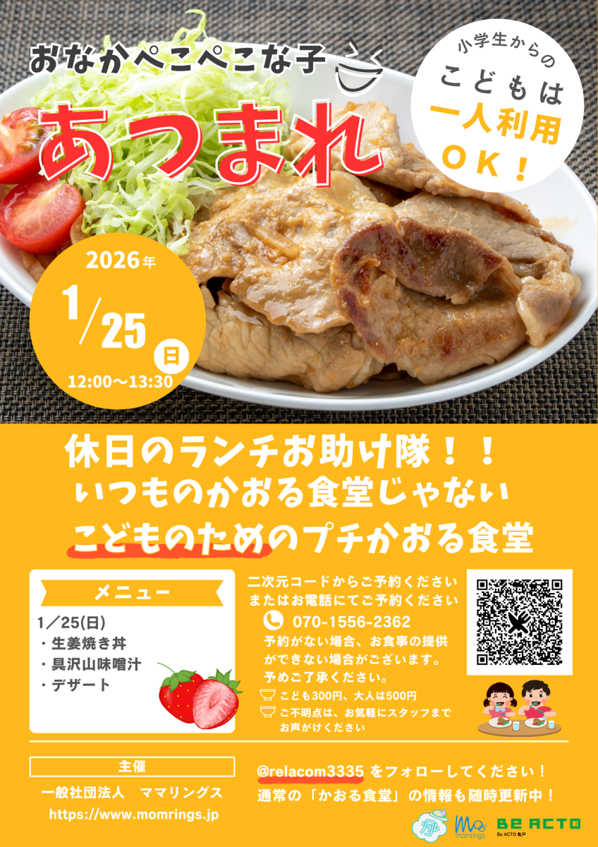 いつもの「かおる食堂」ではなく、小学生が一人でもご利用いただけるよう給食のようなお料理メニュー、価格となります!1食楽に、こどもと一緒にご利用いただけます!