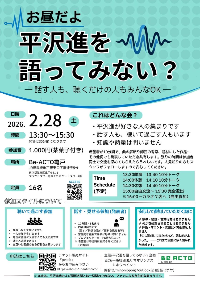 日程:2月28日(土) 13:30〜 15:30 ※ 会場は30分前から