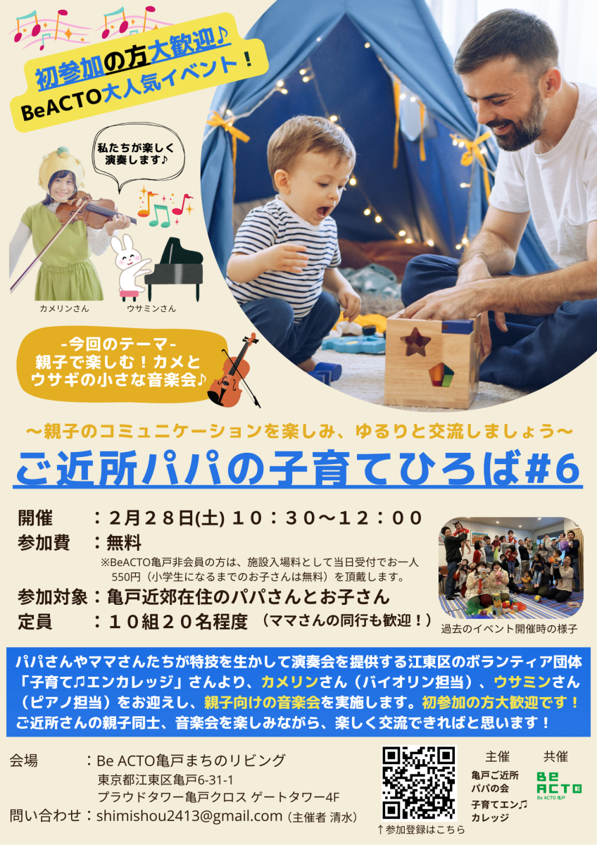 私自身、一人の父親として「亀戸のご近所でパパさん同士がゆるーく交流できる場があったら良いな…」という想いで、Be ACTO亀戸様と共催で 2023 年にこの交流イベントを立ち上げ、パパさんをはじめとした家族同士のコミュニティを作っています。