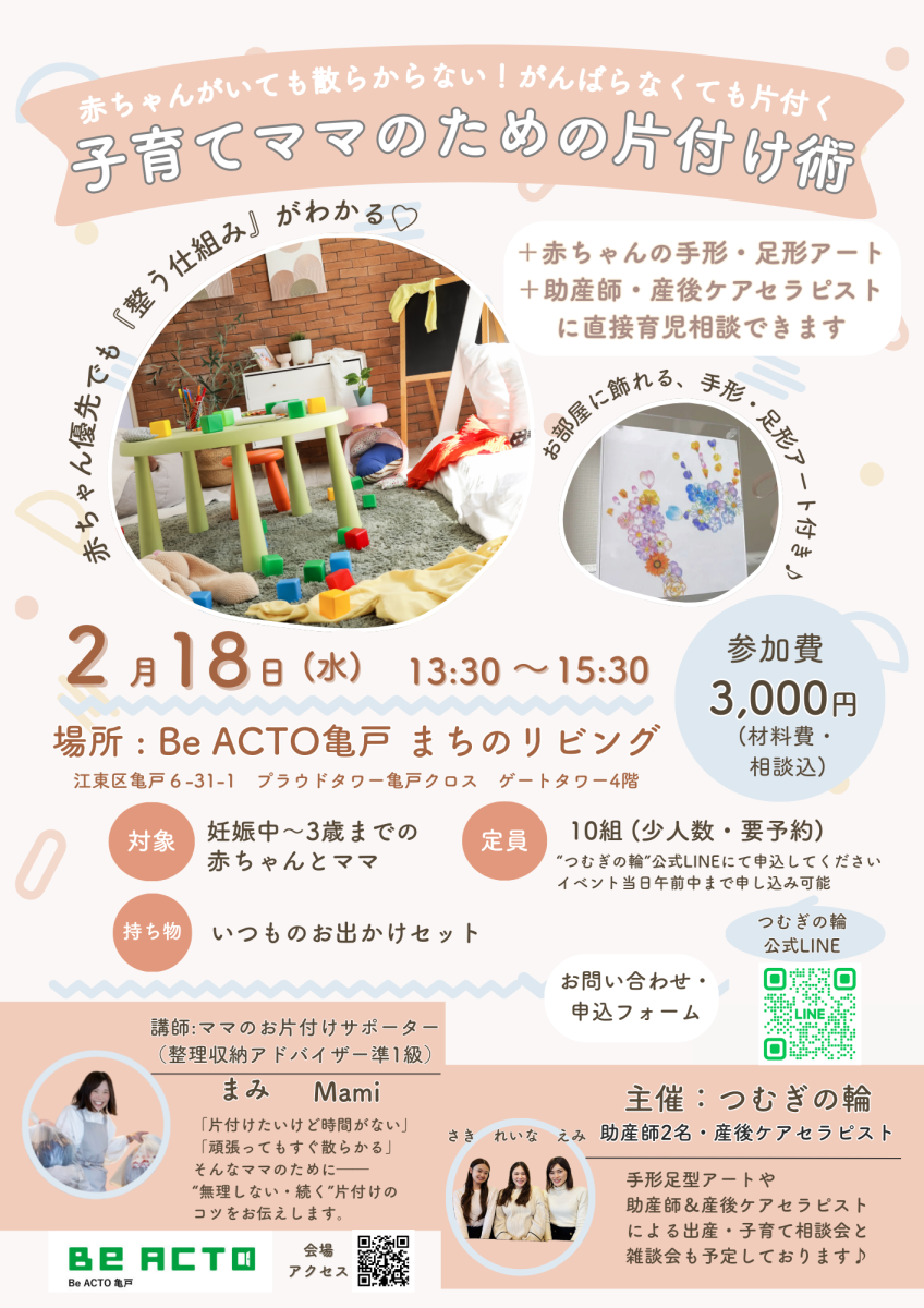 このイベントでは、 子育て中のママが無理なく続けられる “片付く仕組みづくり” を、 整理収納の専門家を講師に迎えて、やさしくお伝えします。