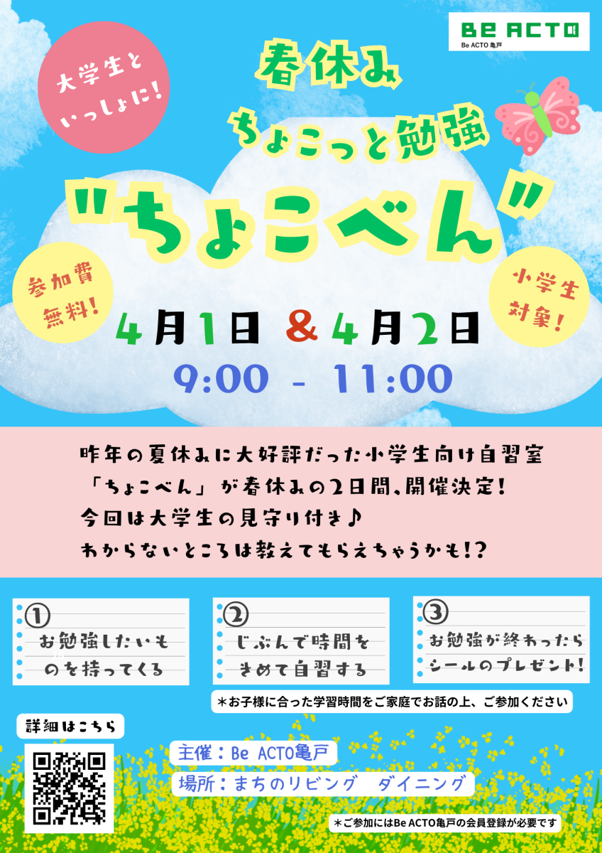 小学生のための自習室!「ちょこべん」春休み開催のおしらせ🌸